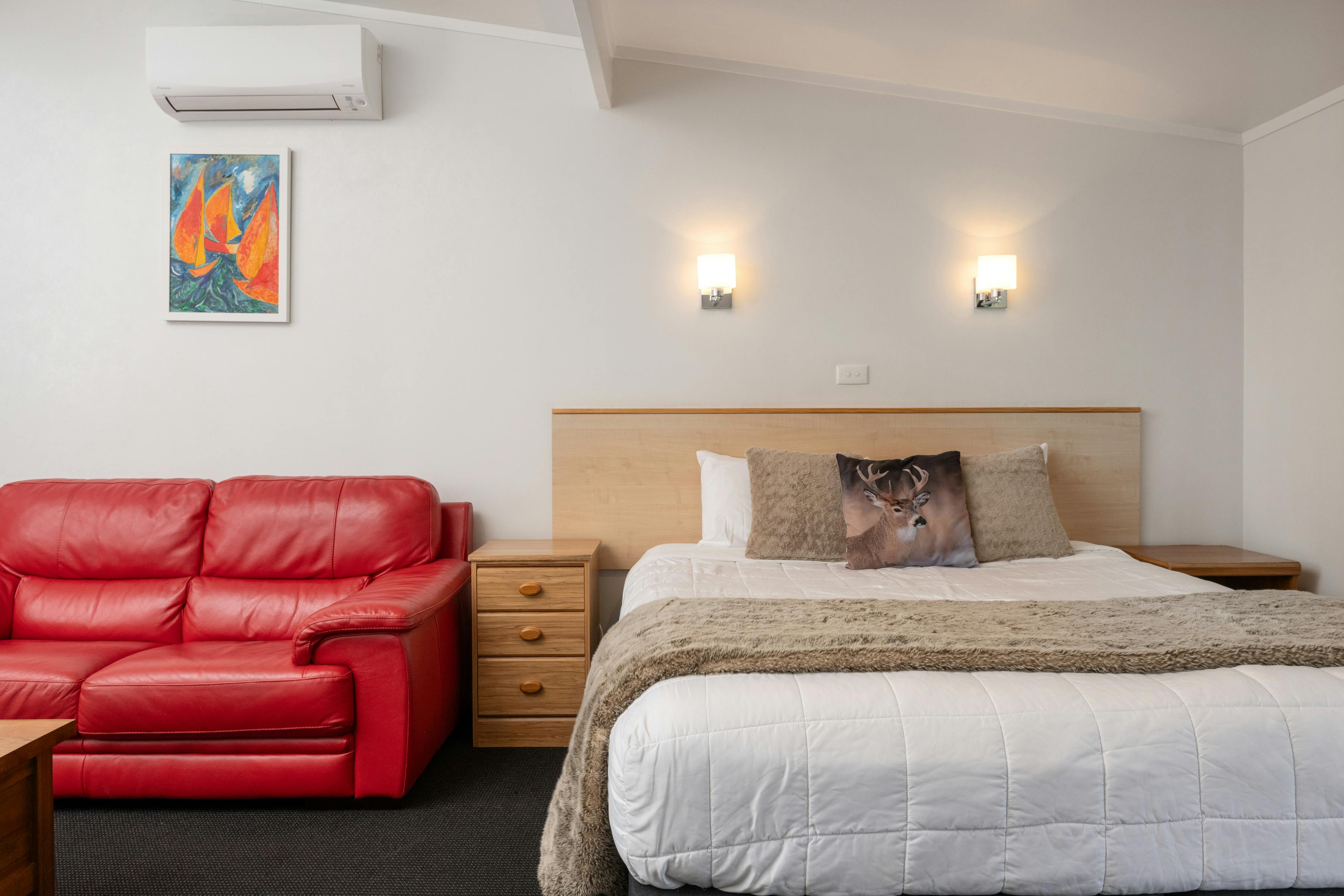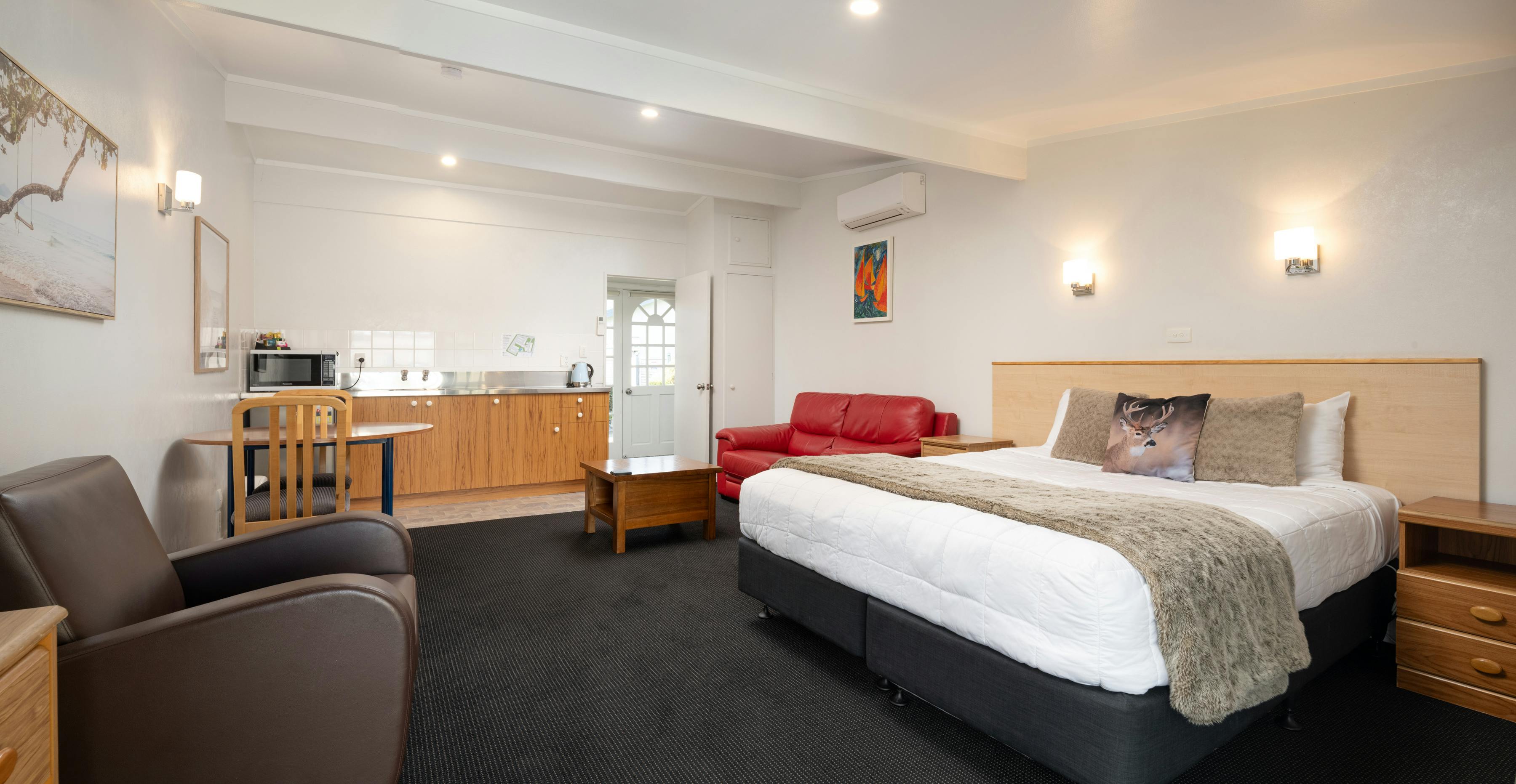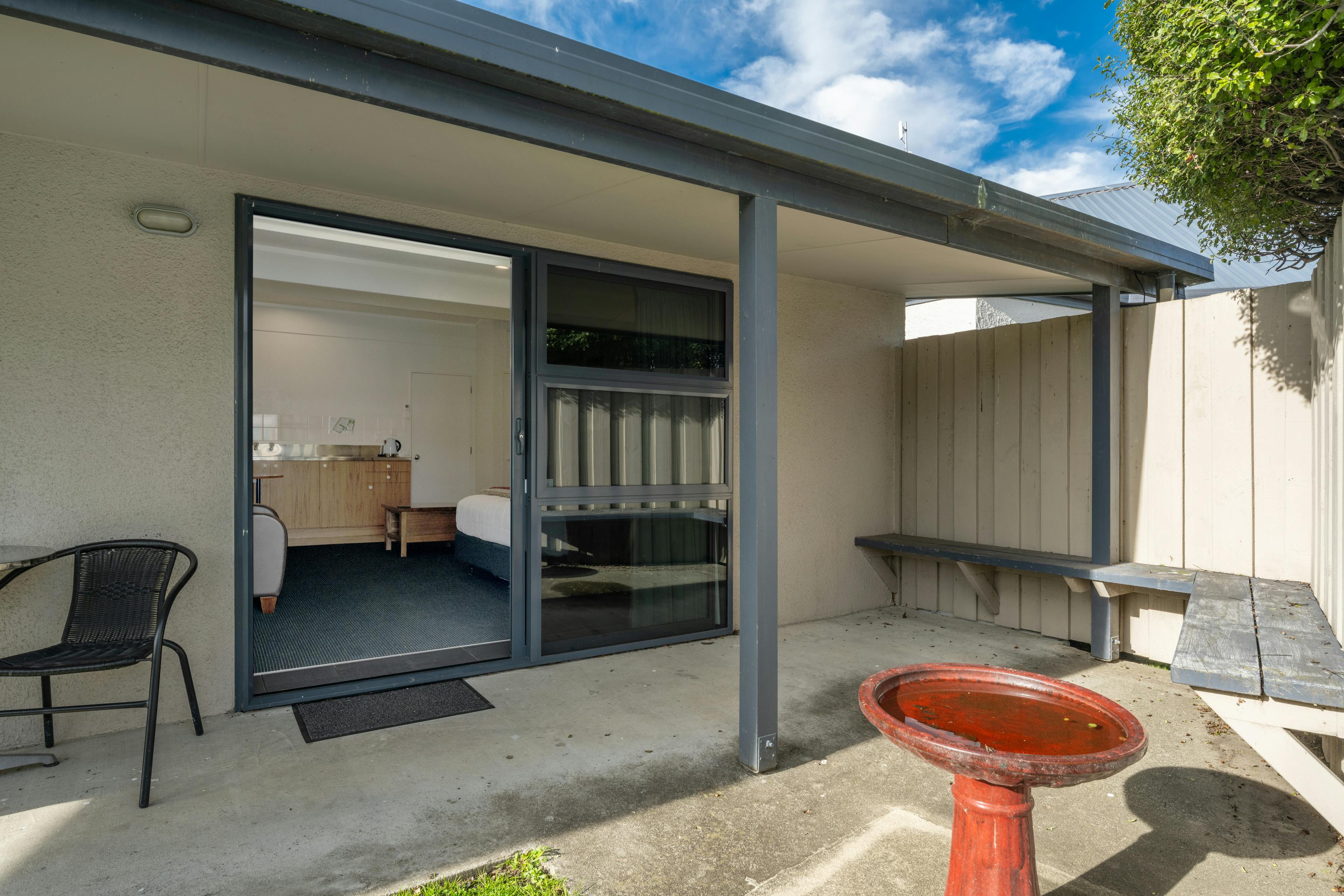 Relax in this comfortable air-conditioned studio, perfect for your stay in Blenheim. The kitchenette has a stovetop, fridge, microwave, and all the basics for preparing simple meals — great if you’d like to enjoy some local Marlborough produce or wine. You’ll also have a flat-screen TV with SKY channels, a private bathroom, and your own patio to sit back and unwind. With one cozy bed, it’s an ideal spot to rest after a day exploring the vineyards, rivers, and beautiful Marlborough Sounds.